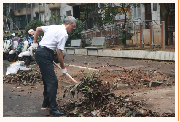 我所党支部副书记李取华同志以身作则,带领我所党员干部率先垂范。他们手持铁锹、扫帚等工具,按照社区工作人员的安排,对倒伏的树木、道路指示牌和散落的树叶,以及下水道井盖口堆积的杂物进行清理。