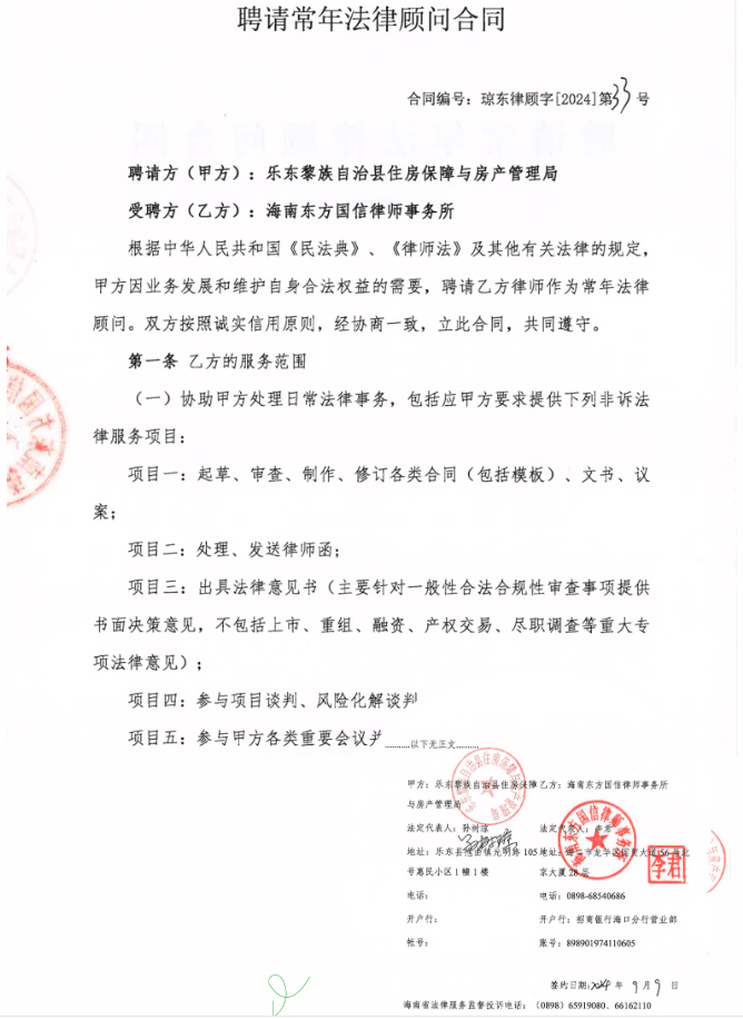 近日,我所合伙人唐萍律师团队传来佳讯,其团队成功与海南省乐东黎族自治县住房保障与房产管理局签订常年法律顾问合同,聘任唐萍律师与其团队陈鑫律师担任法律顾问,聘期自2024年9月10日起至2029年9月9日止,共计5个工作年度。 此次合作期限长达五年,充分彰显了该单位对我所的高度信赖,以及对唐萍律师团队行政法律服务能力的极大认可。在后续合作中,唐萍律师、陈鑫律师将秉承我所“专业、优质、深度、高效”的服务理念,为该单位在政策制定、行政复议与诉讼、重大项目决策等众多方面提供专业法律支持,保障其工作依法依规开展,协助该单位提高法治建设水平,为乐东黎族自治县住房保障与房产管理工作提供法治保障。